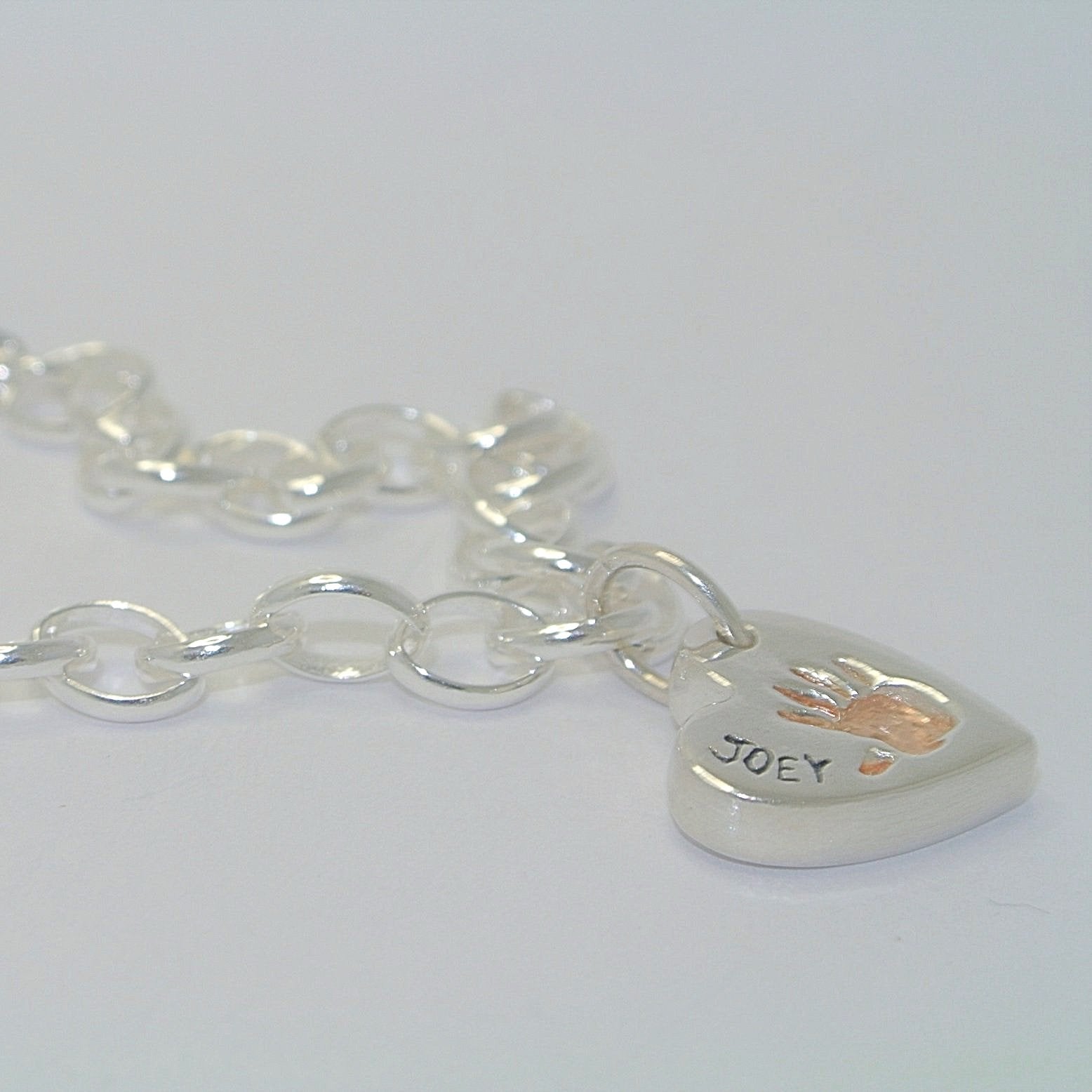 This beautiful handprint rose gold chunky heart charm can sit on any bracelet but looks very pretty on our belcher link sterling silver bracelet or our snake chain bracelet. This charm is double-sided so it can fit two prints, one on each side.